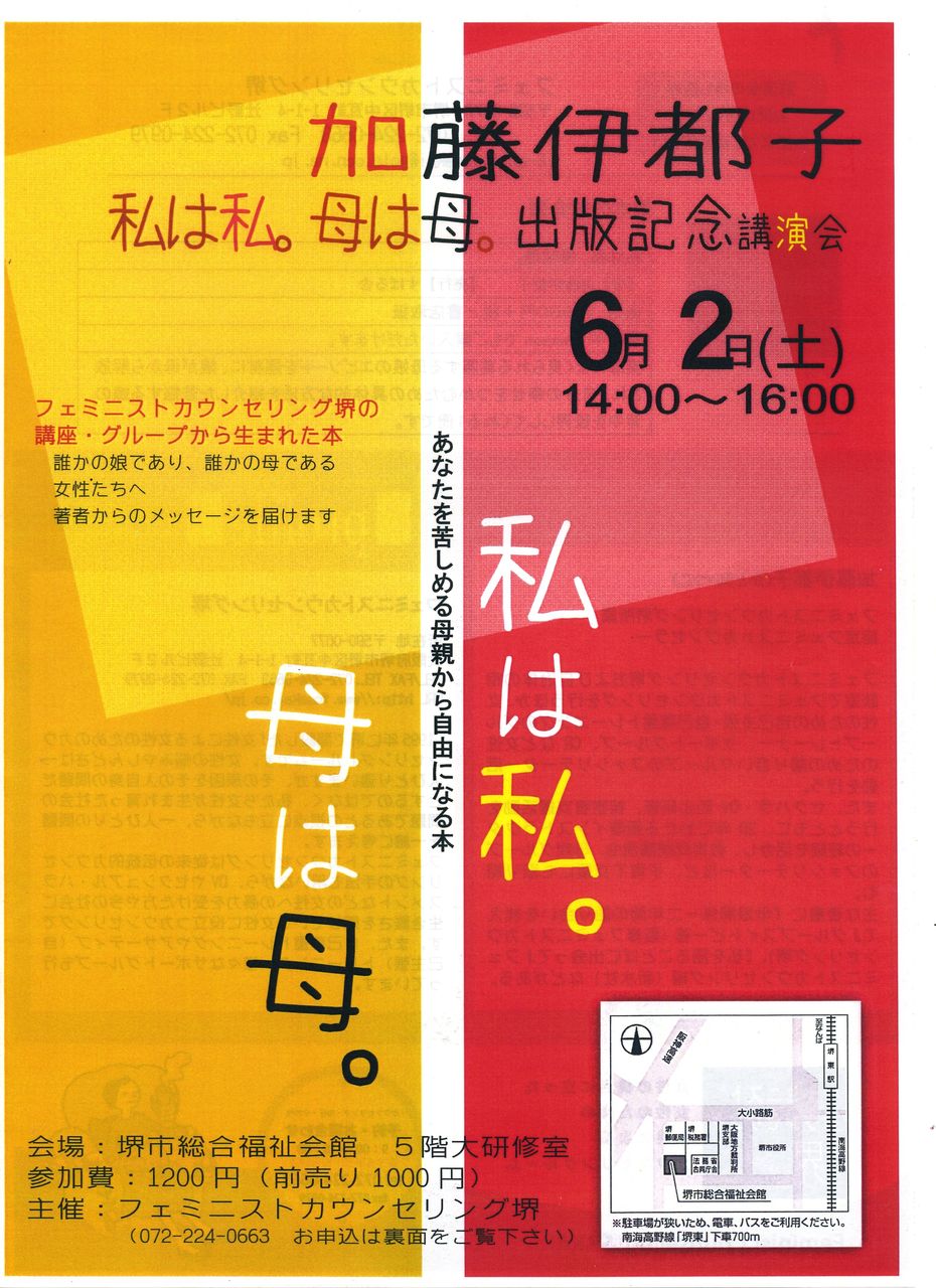5月26日、27日に富山で開催されたフェミニストカウンセリング全国大会も終わり、5月が終わろうとしています。フェミニストカウンセリング堺の6月は「加藤伊都子出版記念講演会『私は私。母は母。』」から始まります。